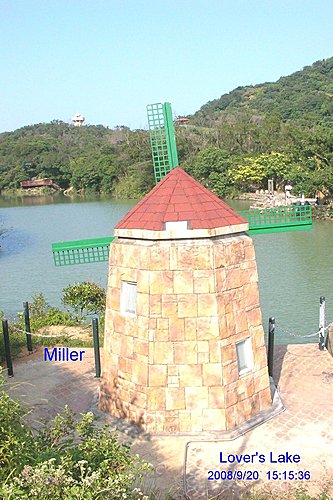 多年以前的風車, 是木材製造, 可能經不起日曬雨淋而朽壞, 現今改為磚瓦水泥, 想必堅固許多, 只是那扇葉用鐵條鑄造, 想扳動它可是得費大大的勁才行. 左邊遠處即為觀景塔樓.