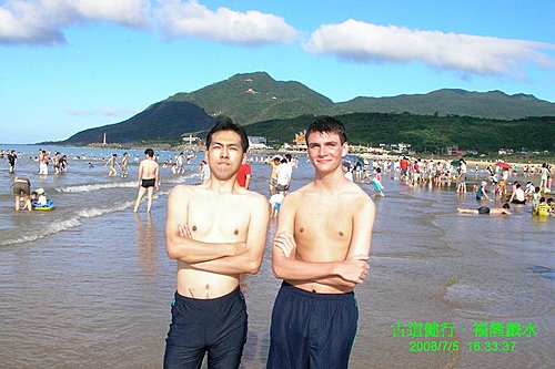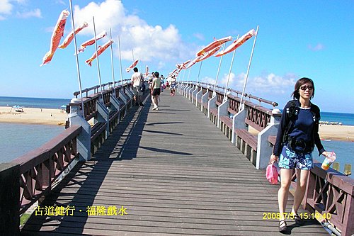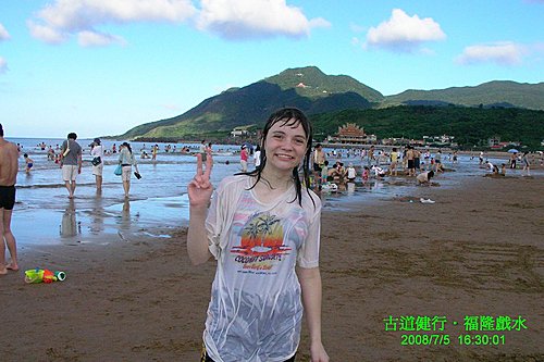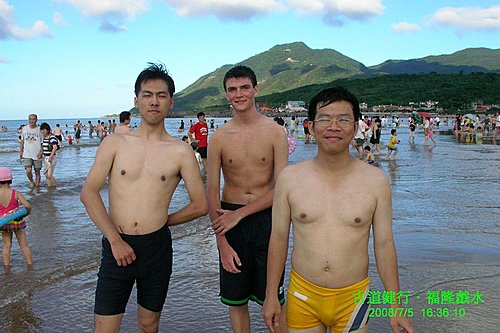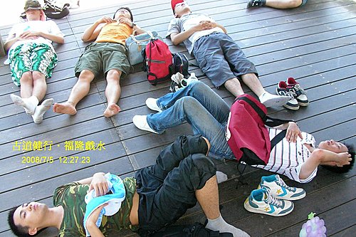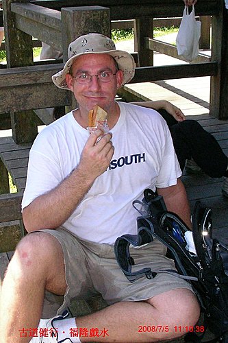 十分鐘路程, 我們就到福隆了, 就在站前享用福隆便當, 走了五個鐘頭就是為了它...心中還真是五味雜陳. 在浴場入口處, 會合 Tom 幾位朋友以及依Plan B前來的Kendra, Eileen等人. 而 Rachel 因有同事相約此地見面, 隨後與同事他去. 在入口處找到幾位準備入浴場的朋友, 讓我們湊成買團體票的門檻, 感謝你們!