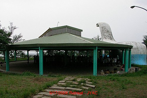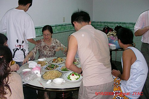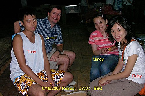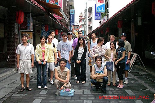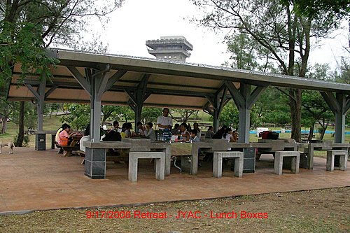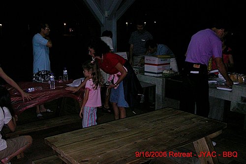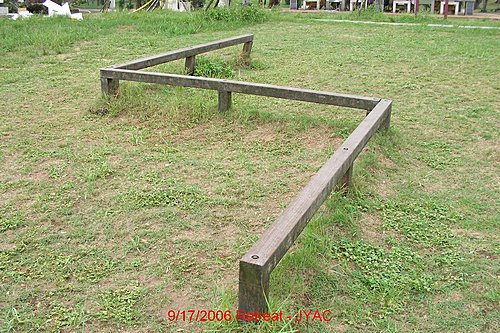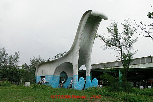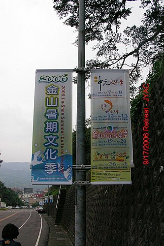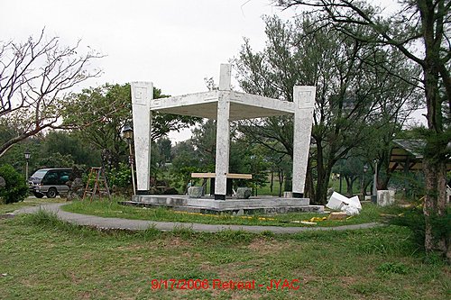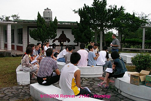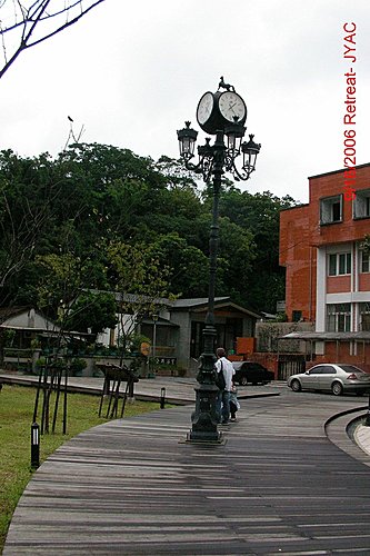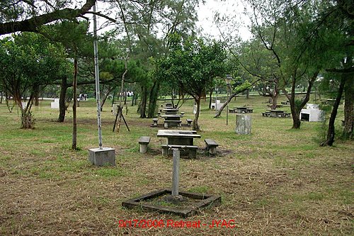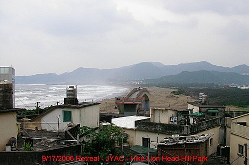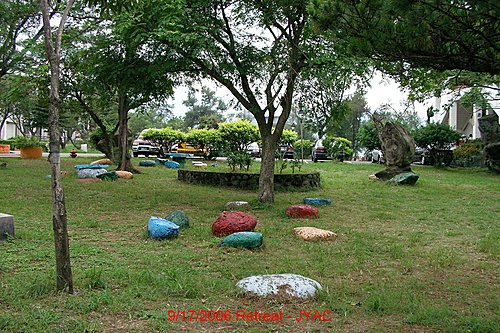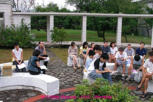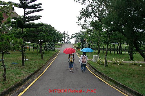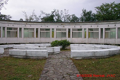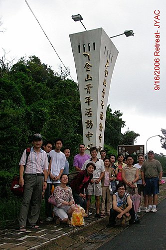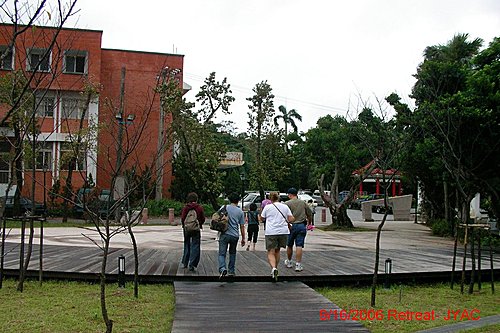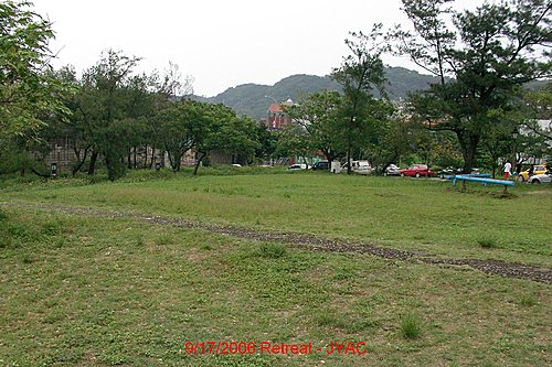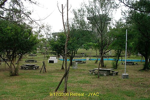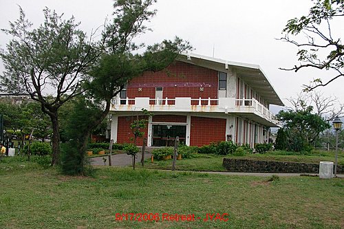 這是此次 Retreat 上課的大本營,金山青年活動中心的天祥村, 雖然颱風"珊珊"而行, 卻也迤邐而去, 所幸老天爺知道我們經費拮据, 租不起上課的教室, 接連著兩天, 天雖然陰陰的, 偶爾飄點雨絲, 卻一點都不影響我們在戶外的所有活動...感謝主之餘, 不得不讚嘆造物主的神機妙算!{原本是餐風宿露的搭帳蓬, 因颱風有人退房, 使得我們除有房間外, 就連 BBQ 都是獨佔一大有棚的烤肉營地(三組人馬自動擴佔八組的營地) (左邊一間是男生宿舍之一)}