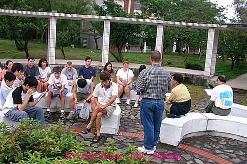 第二天用過早餐後, 大夥又各自悠哉地閒逛一圈園區; 早課在Duff 的帶領下上得輕鬆愉快, (由 Paul 中文解說) 一點都看不出大家幾幾乎一夜嬉鬧到近天光才安歇. (頭低低的我們, 是在"傾聽中", 不是"度咕"喔!)